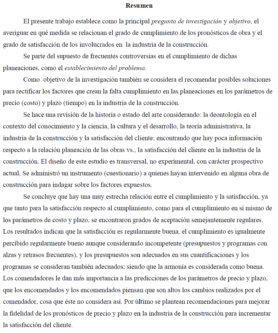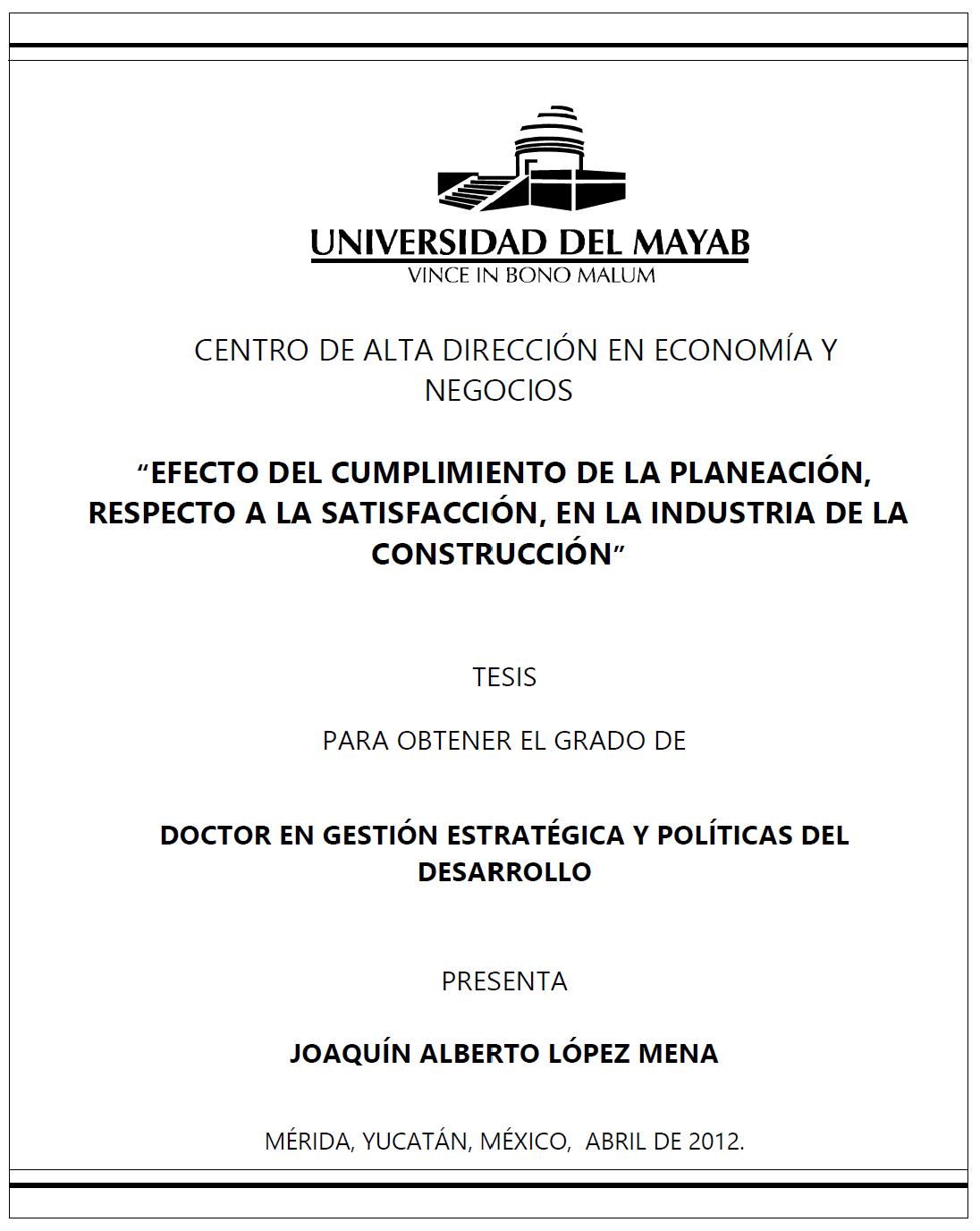 EFECTO DEL CUMPLIMIENTO DE LA PLANEACIÓN, RESPECTO A LA SATISFACCIÓN, EN LA INDUSTRIA DE LA CONSTRUCCIÓN Tesis Doctoral 2012 Contratación de Obras. Un enfoque computarizado de su Planeación y Control Tesis de Maestría 1984